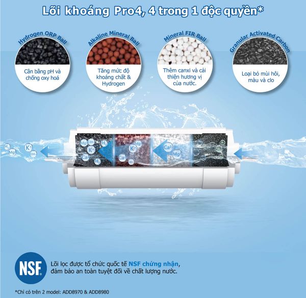 Máy sử dụng màng lọc RO DOW nhập khẩu từ Mỹ, máy đạt chứng nhận NSF cho bộ lọc khoáng và lõi bù khoáng 4 trong 1 độc quyền mang đến cho bạn nguồn nước sạch an toàn sức khỏe.