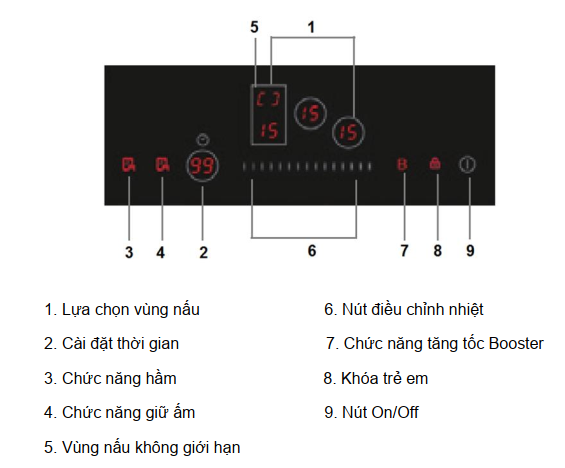 - Hệ thống điều khiển cảm ứng hiện đại với 15 mức độ gia nhiệt khác nhau