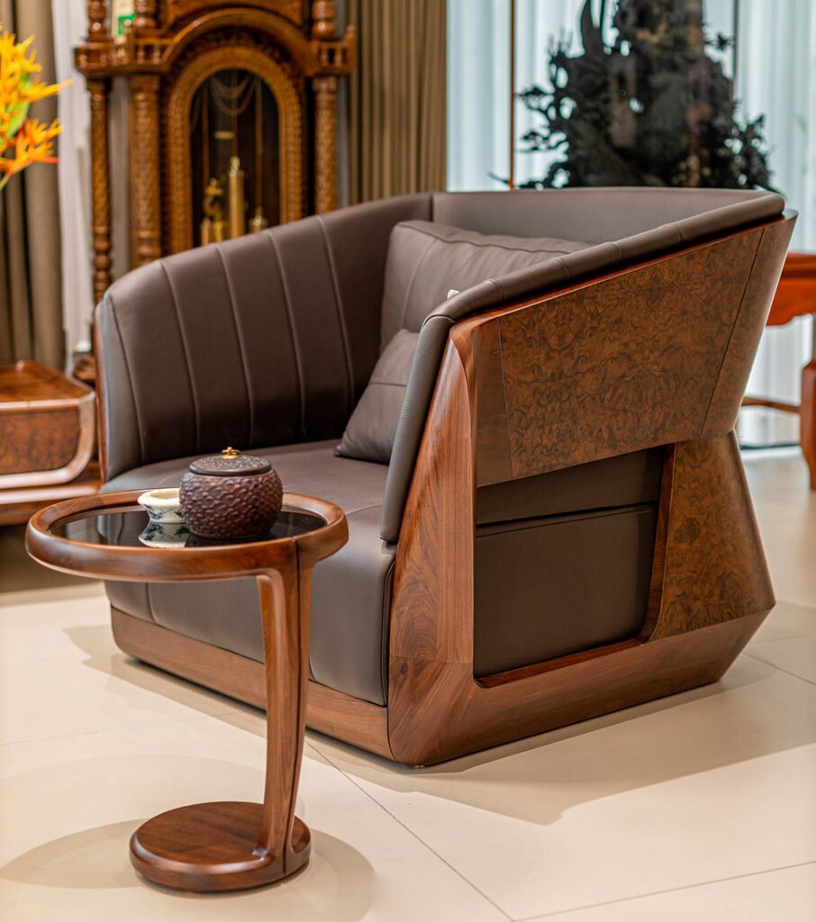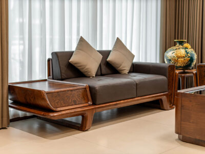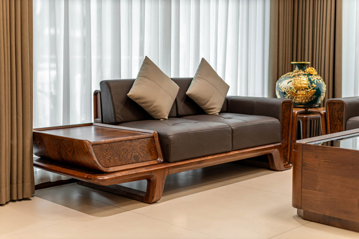 Ấn tượng đầu tiên khi nhìn thấy bộ sofa gỗ óc chó hiện đại là sự tinh tế, đẹp mắt. Người nhìn càng ngắm càng bị cuốn hút không nỡ rời mắt khỏi. Sản phẩm sofa gỗ gồm 2 ghế dài, 1 ghế đơn và 1 bàn trà đồng bộ cùng chất liệu gỗ óc chó quý hiếm.