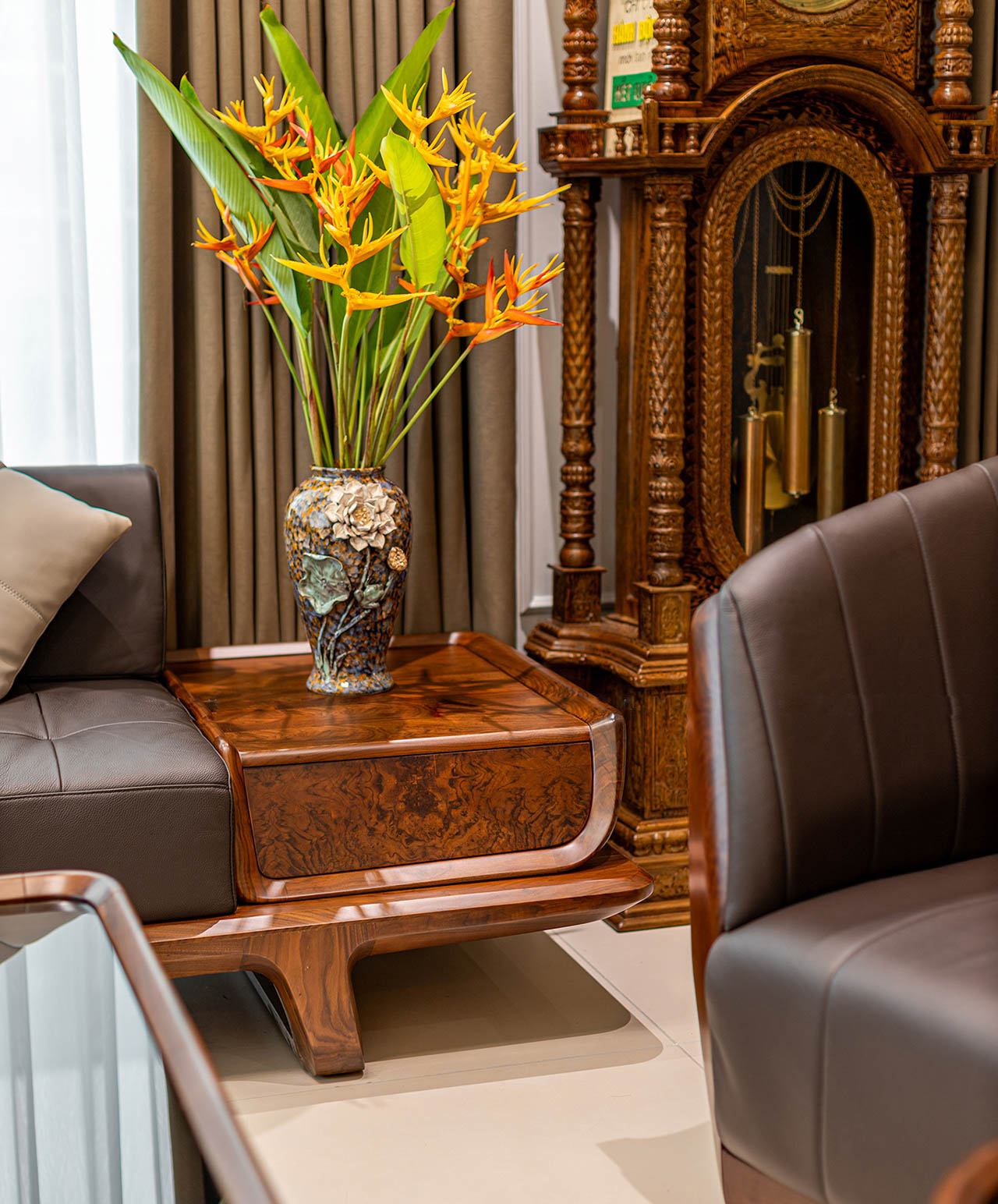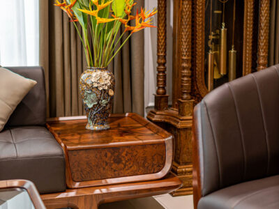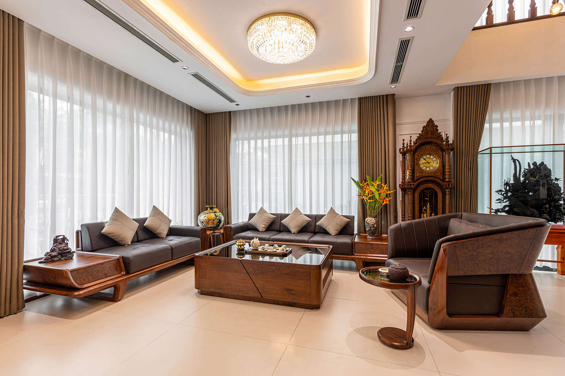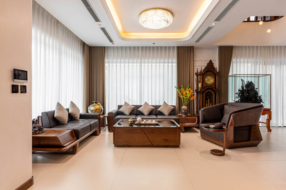 Một bộ ghế sofa đẹp phải kèm theo bàn trà gỗ óc chó đồng bộ để toát lên phong cách và gu thẩm mỹ riêng biệt của gia chủ. Bàn trà có hình hộp chữ nhật với phần mặt bàn kính cường lực bóng láng, dễ dàng lau chùi. Các góc cạnh xung quanh được trau chuốt tỉ mỉ từng đường nét tạo sự mềm mại nhưng cũng đầy khỏe khoắn, phóng khoáng.