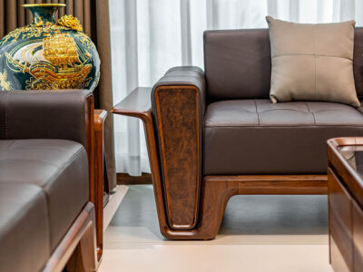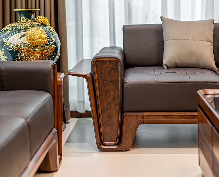 Không chỉ vậy, sofa gỗ óc chó hiện đại còn trang bị nệm da, gối ôm cao cấp được nhập khẩu từ nước ngoài. Nệm da, gối ôm khi kết hợp với màu nâu trầm của sofa càng tăng thêm sự sang chảnh, quý phái và thời thượng. Chất liệu da bền màu, không bị sờn, bạc hay xuống cấp nhanh chóng.