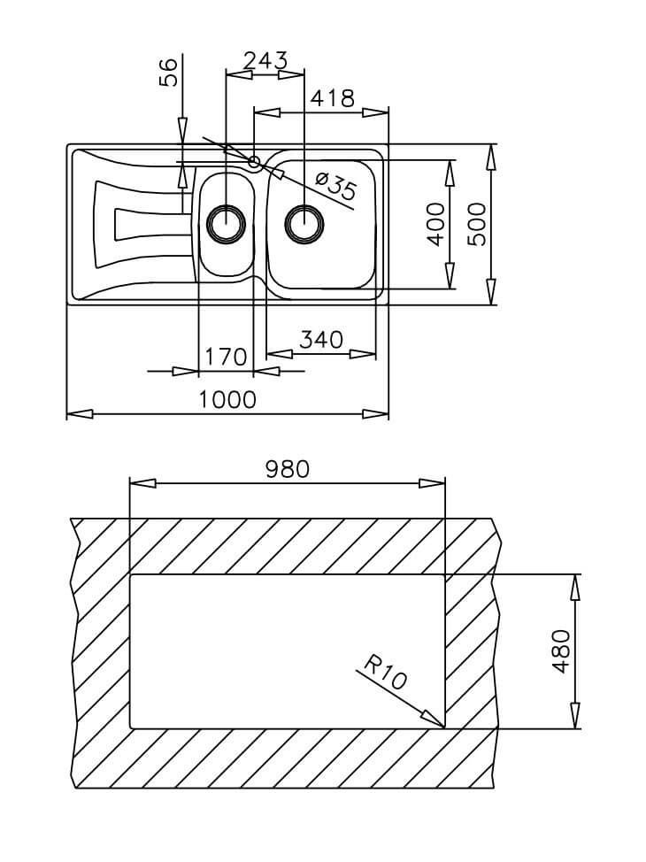 - Kích thước bồn (D x R x S): 340 x 400 x 160 mm / 170 x 320 x 95 mm
