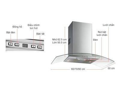 - Máy được trang bị 03 tốc độ hút và 01 chế độ hút tăng cường, hoạt động với mức công suất cao, đảm bảo đem lại không khí trong lành cho phòng bếp của bạn