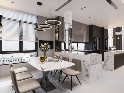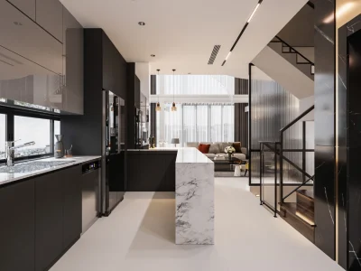 Tủ bếp mang phong cách hiện đại đến từ sự đơn giản với các đường nét, các khối nối liền nhau tạo nên không gian nội thất. Tủ bếp tối ưu vào hiệu quả của công năng sử dụng, tránh các chi tiết hoa mĩ rườm rà. Bố trí thiết bị nhà bếp, đồ đạc gọn gàng tạo không gian thông thoáng, thuận lợi cho việc di chuyển đi lại sinh hoạt tại bếp nấu.