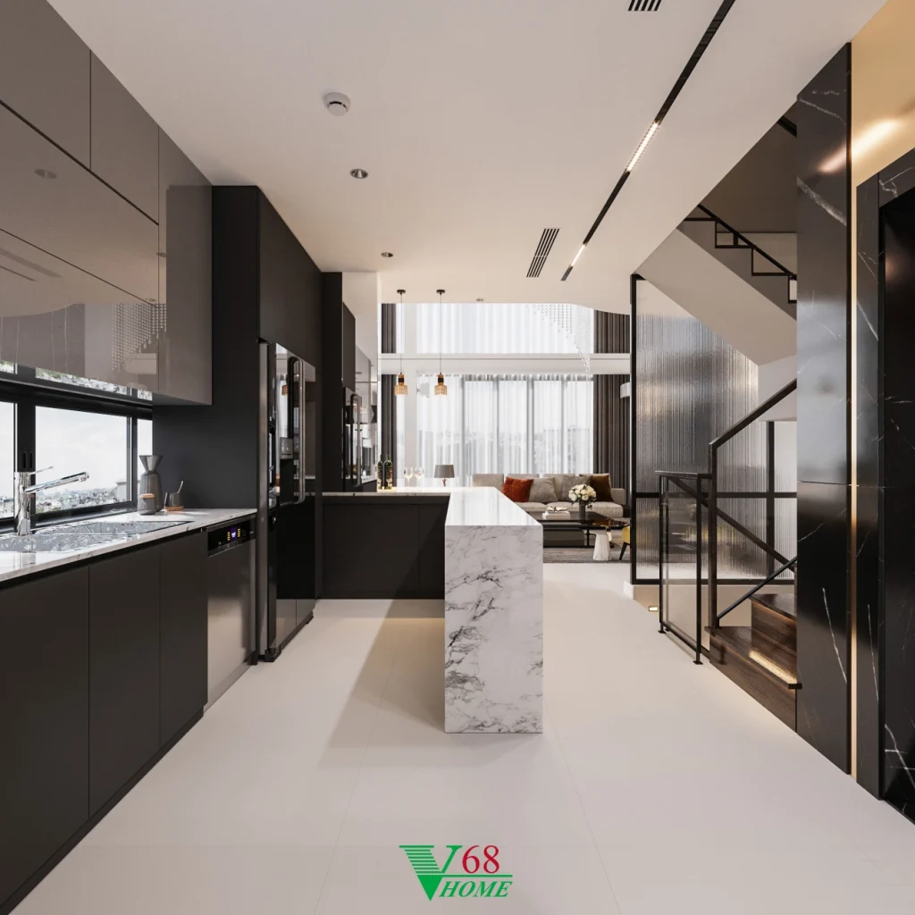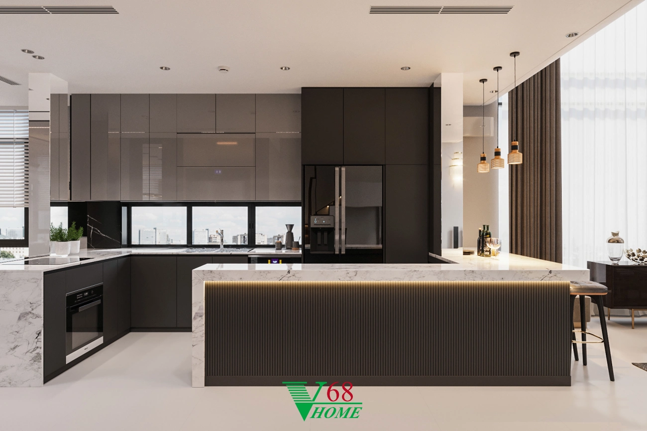Mẫu tủ bếp TB18 được Nội thất V68 thiết kế và hoàn thiện tại căn hộ Duplex Văn Cao. Mẫu tủ bếp được thiết kế với hình chữ U giúp tối ưu công năng sử dụng.