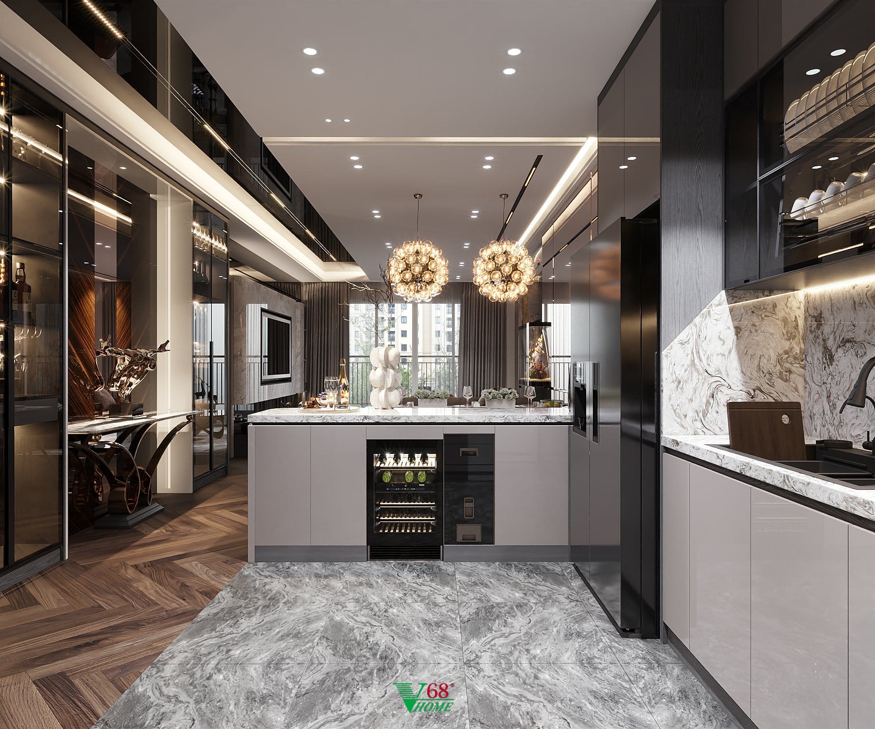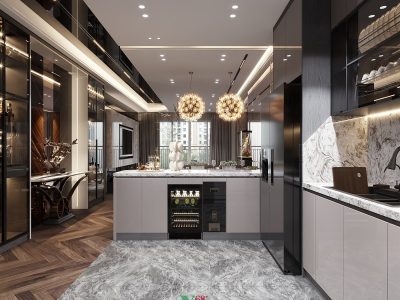 Chất liệu | Gỗ MDF xanh chống ẩm An Cường với tủ bếp dưới phủ Acrylic bóng gương, tủ bếp trên cánh kính sang trọng, sử dụng mặt đá tự nhiên |