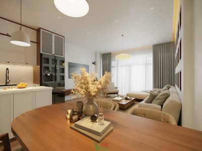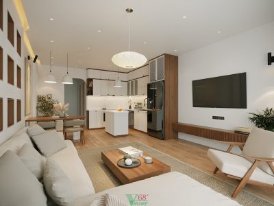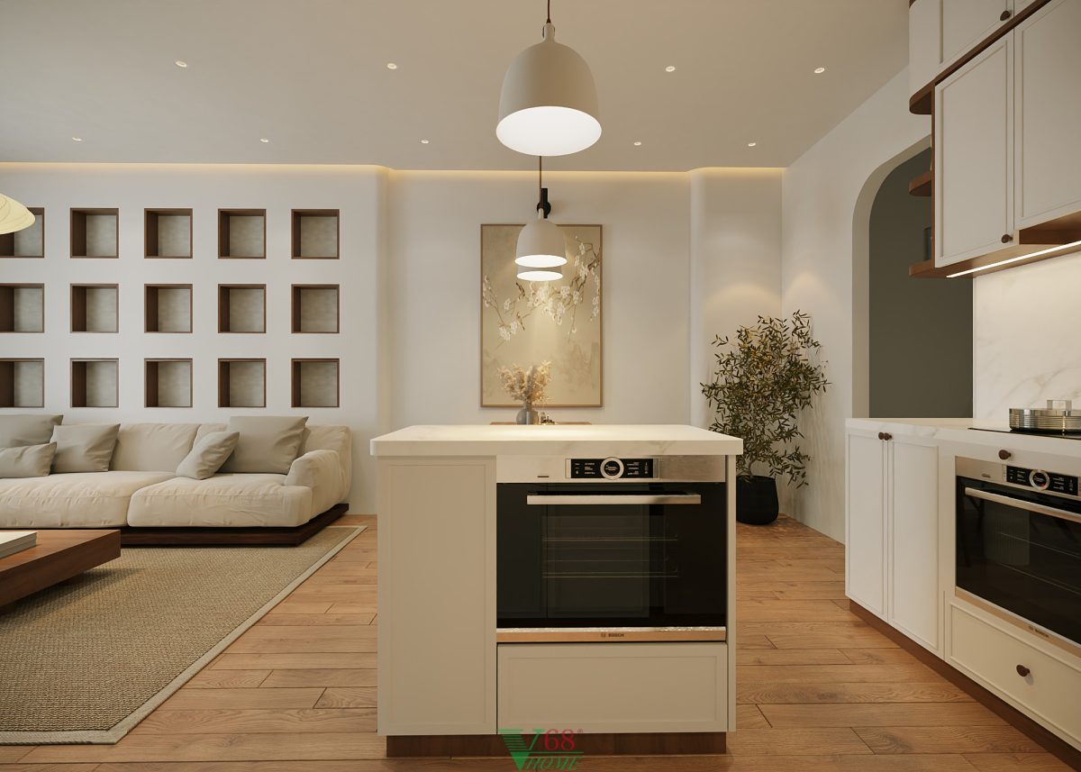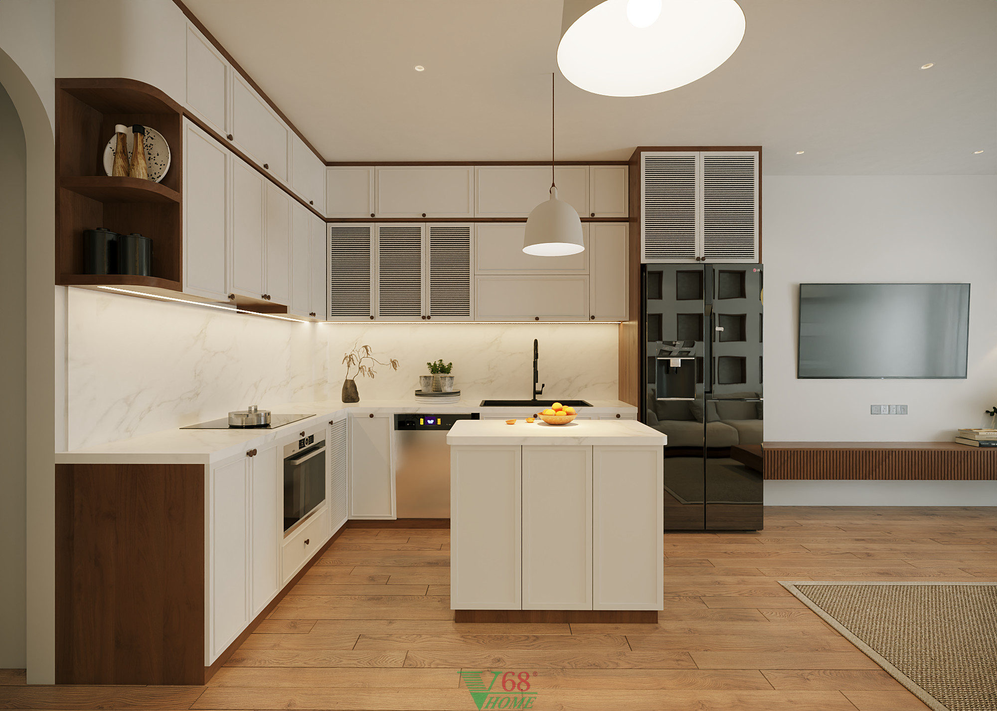 Mẫu tủ bếp TB19 được Nội thất V68 thiết kế và hoàn thiện tại nhà phố đường Trịnh Công Sơn. Mẫu tủ bếp được thiết kế với hình chữ L với tông màu sơn trắng kết hợp với màu gỗ trong một không gian tổng thể thông với phòng khách đẹp hài hòa
