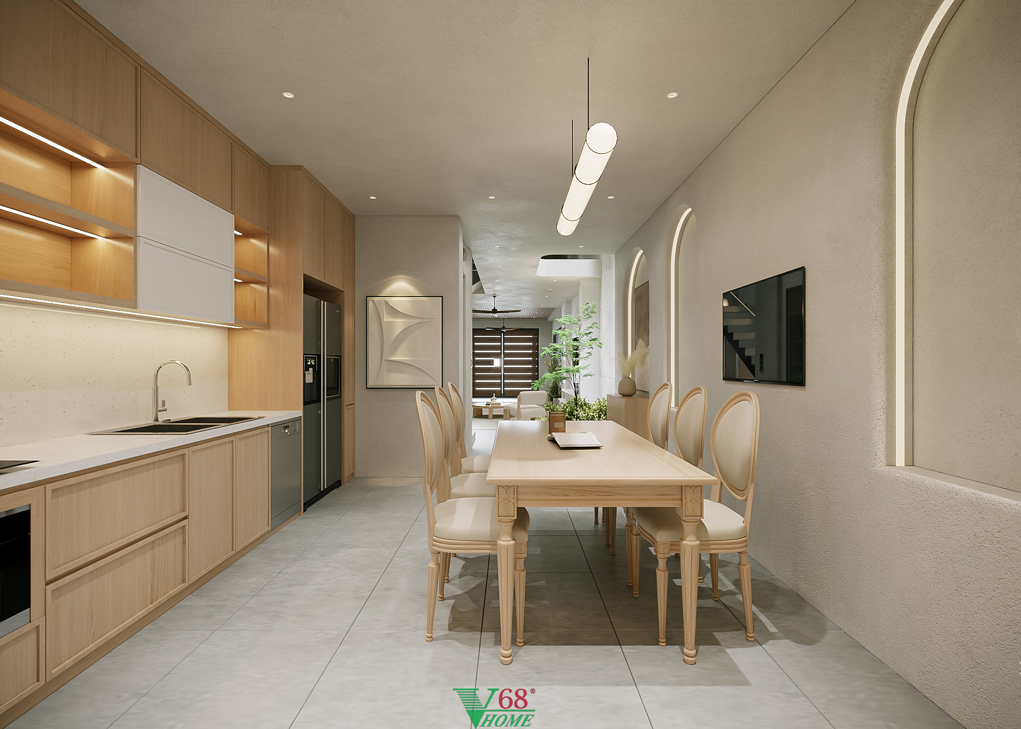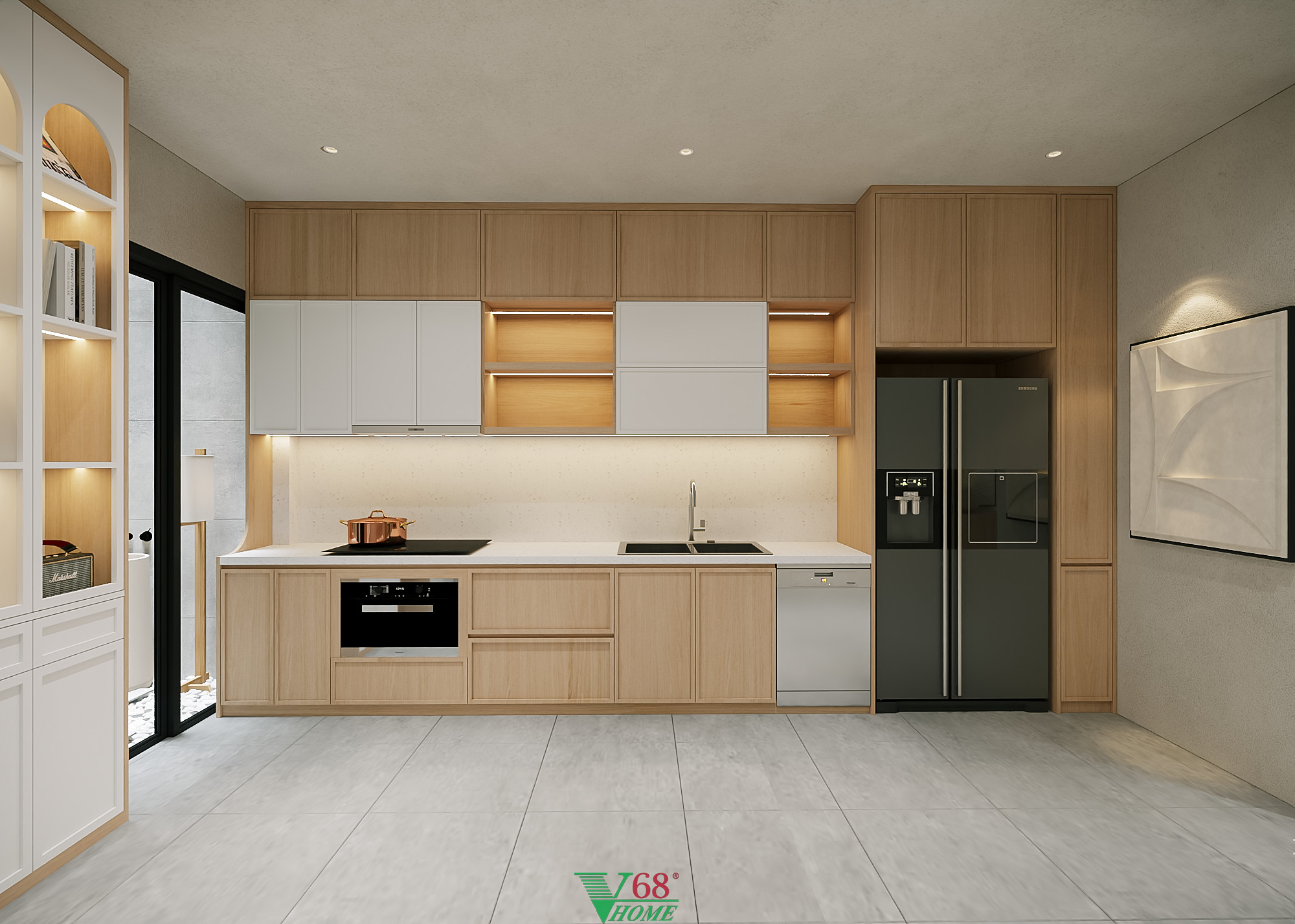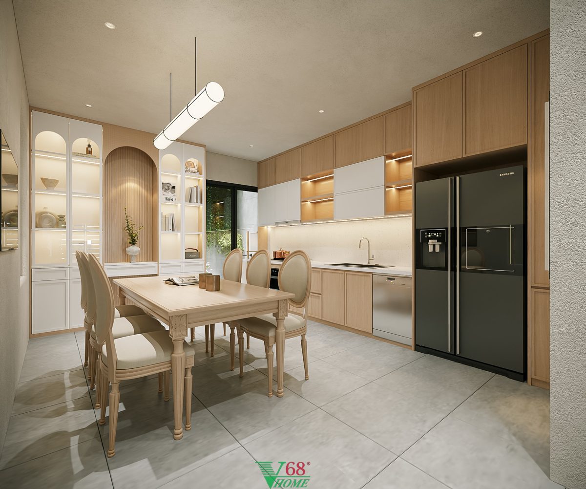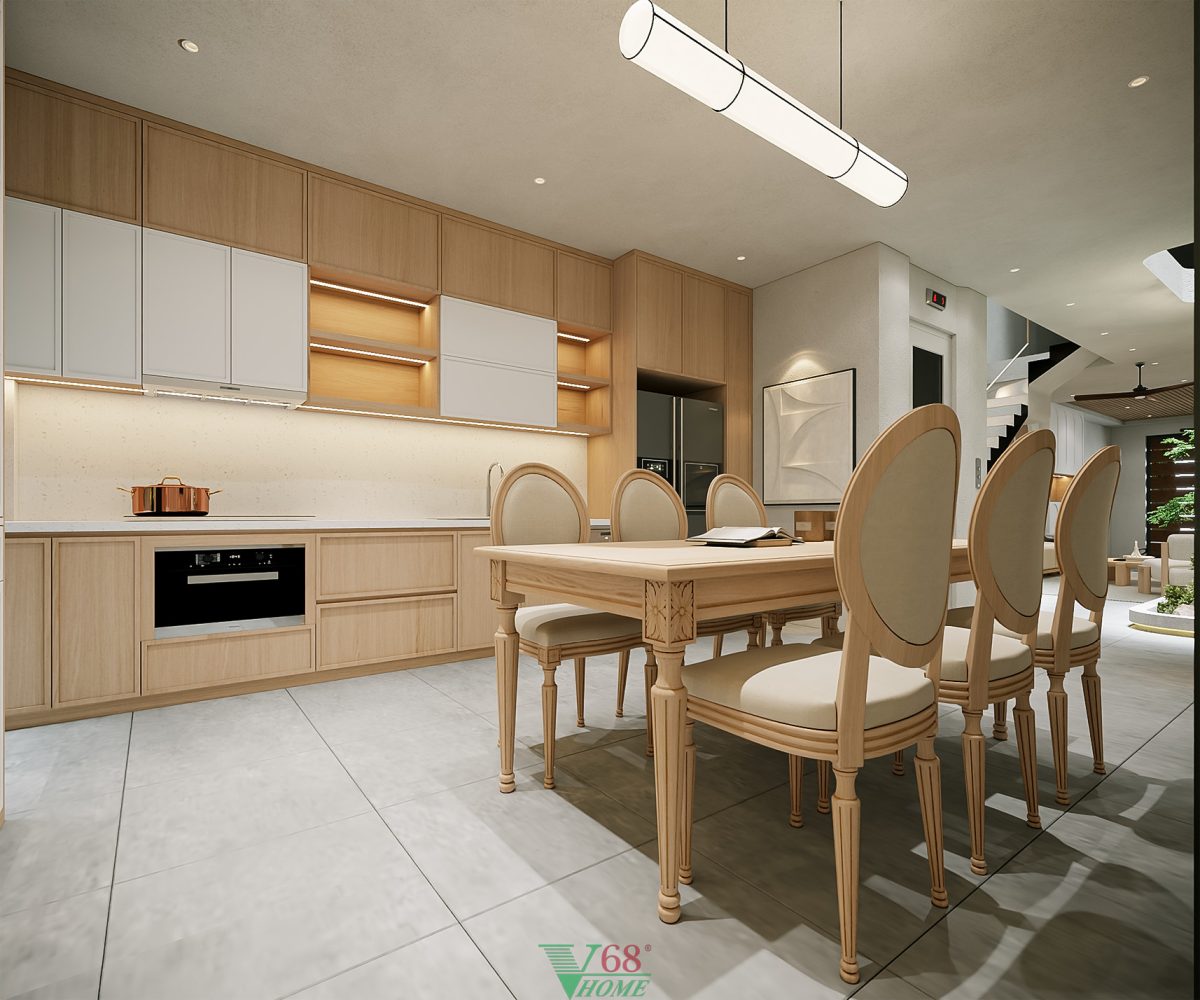 Mẫu tủ bếp TB13 được Nội thất V68 thiết kế và hoàn thiện trọn gói cho nhà phố liền kề tại Hà Nội. Xem đầy đủ thiết kế căn hộ tại đây nội thất tổng thể của cả căn nhà được thiết kế theo phong cách Scanadivian với tông màu trắng kết hợp với màu gỗ sồi tạo nên một không gian sáng sủa với các gam màu tự nhiên.