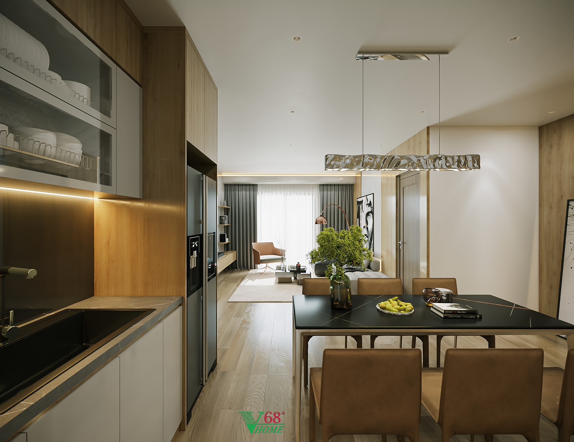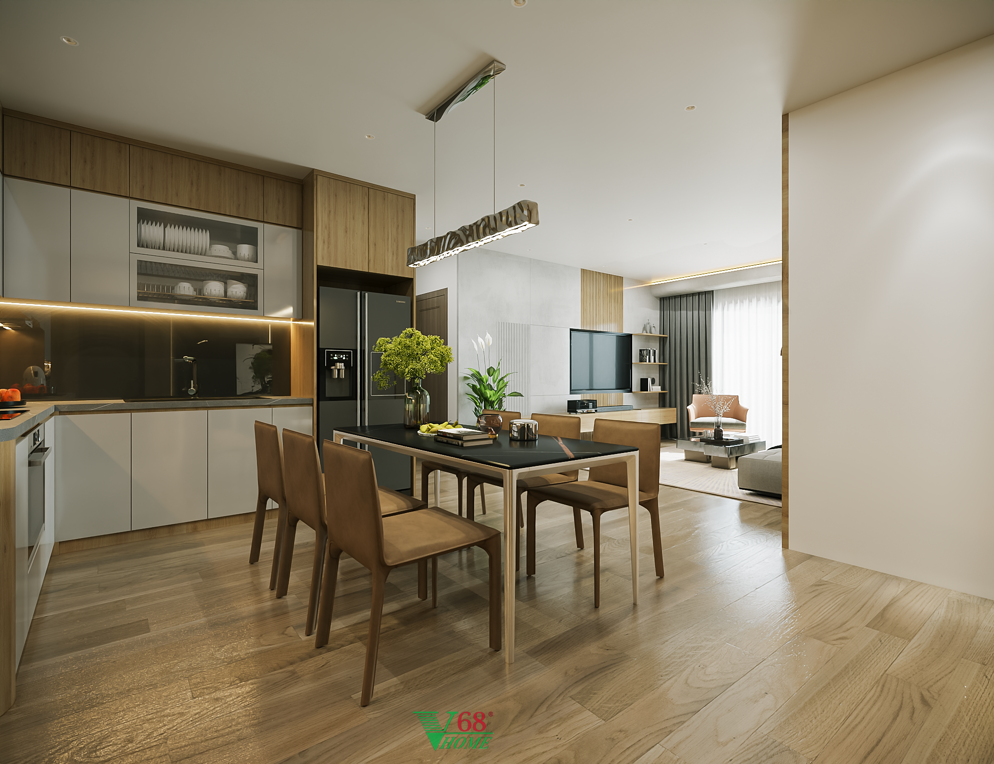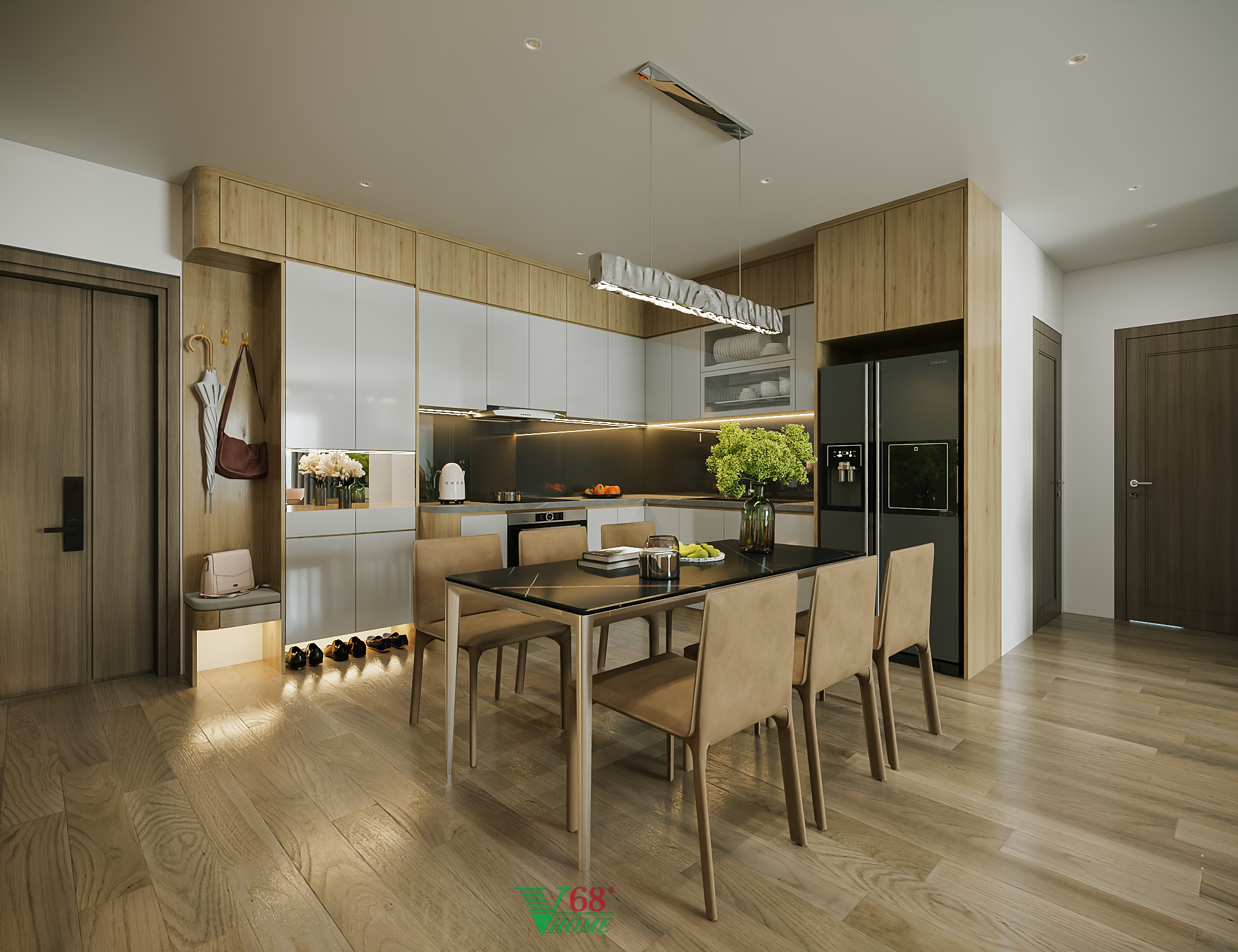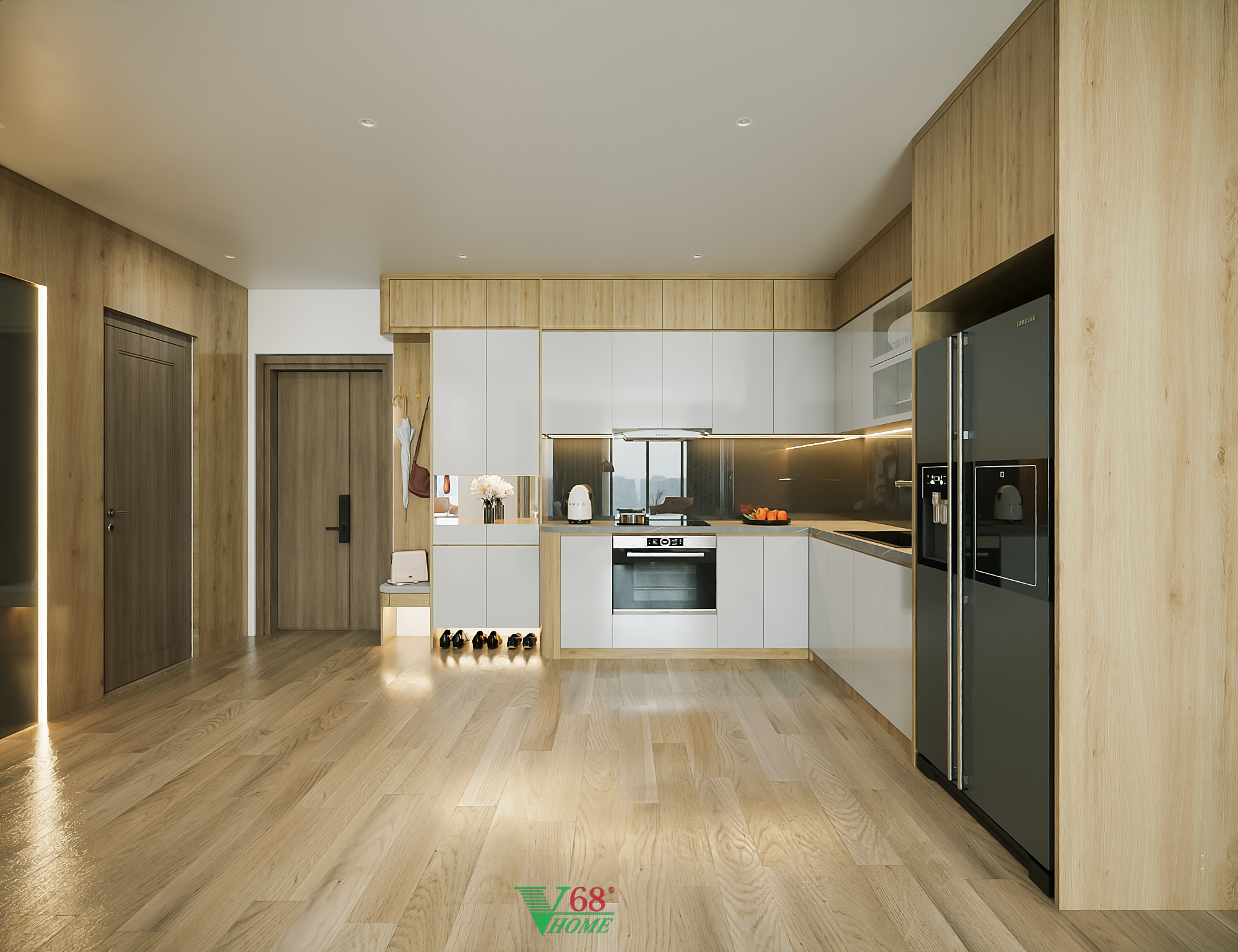Mẫu tủ bếp TB13 được Nội thất V68 thiết kế và hoàn thiện trọn gói cho căn hộ chung cư tại dự án Pavilon Hà Nội. Xem đầy đủ thiết kế căn hộ tại đây Mẫu tủ bếp được thiết kế liền tủ giày để tối ưu công năng sử dụng và diện tích cho căn hộ.Tủ được trang trí thêm đèn LED