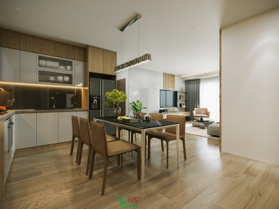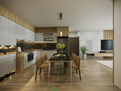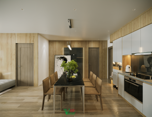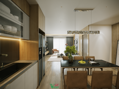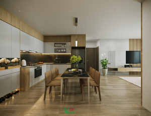 Tủ bếp mang phong cách hiện đại đến từ sự đơn giản với các đường nét, các khối nối liền nhau tạo nên không gian nội thất. Tủ bếp tối ưu vào hiệu quả của công năng sử dụng, tránh các chi tiết hoa mĩ rườm rà. Bố trí thiết bị nhà bếp, đồ đạc gọn gàng tạo không gian thông thoáng, thuận lợi cho việc di chuyển đi lại sinh hoạt tại bếp nấu.