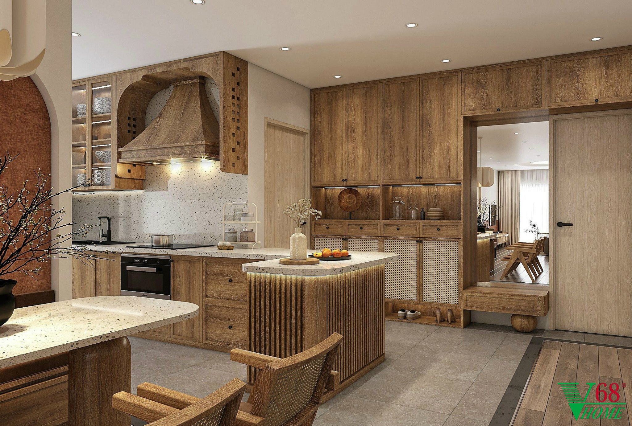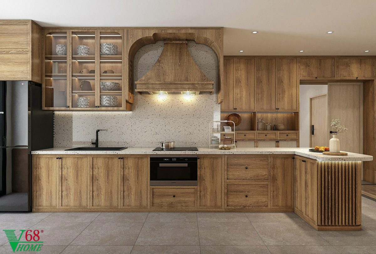 Tủ bếp TB09 sử dụng gỗ MDF xanh chống ẩm phủ Melamine phù gỗ mộc mạc. Tủ bếp dưới thiết kế với cánh pano cùng với nan gỗ. Khu vực để hút mùi được trang trí rất tinh tế.