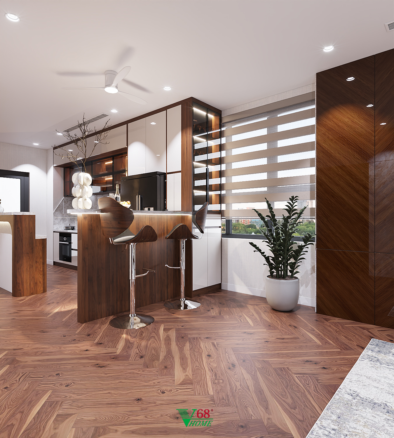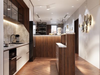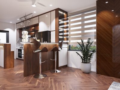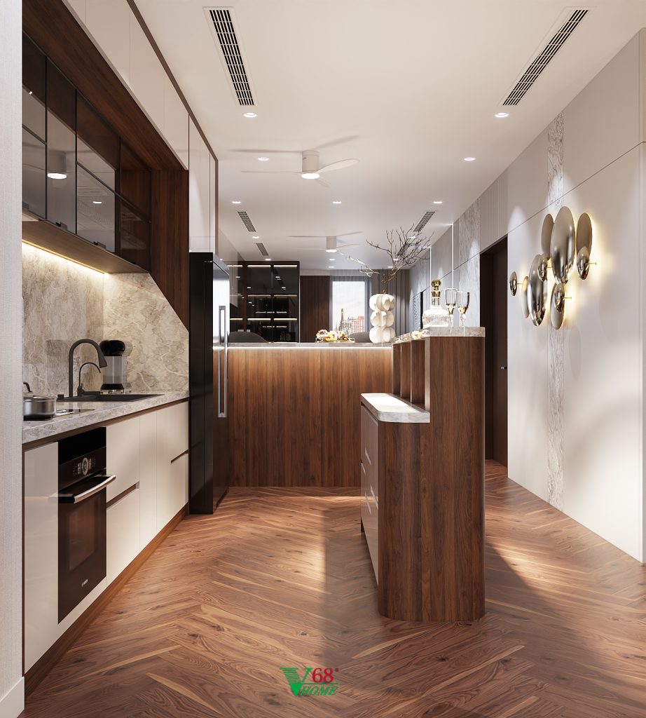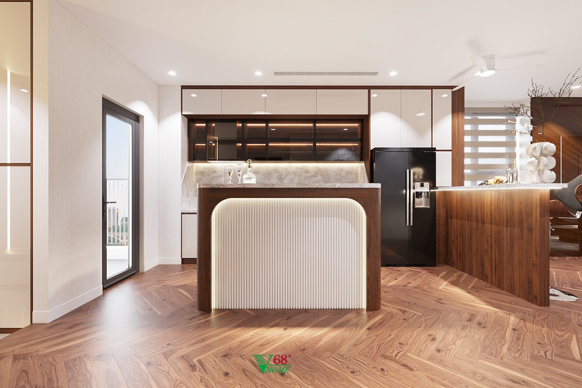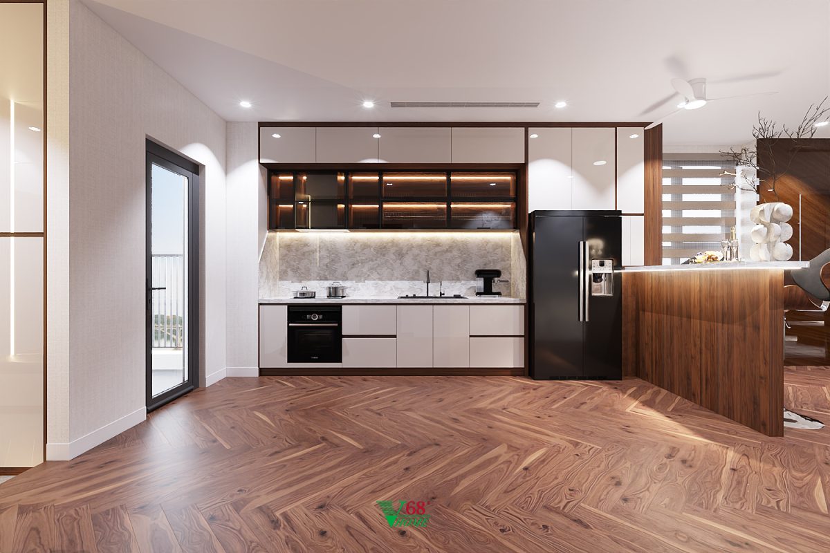 Mẫu tủ bếp TB11 được Nội thất V68 thiết kế và hoàn thiện trọn gói cho căn hộ chung cư tại Hà Nội.
