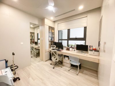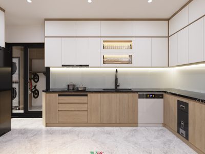 - Tính thẩm mỹ: Tủ bếp sở hữu thiết kế hiện đại, sang trọng với gam màu trắng phối xám thanh lịch.