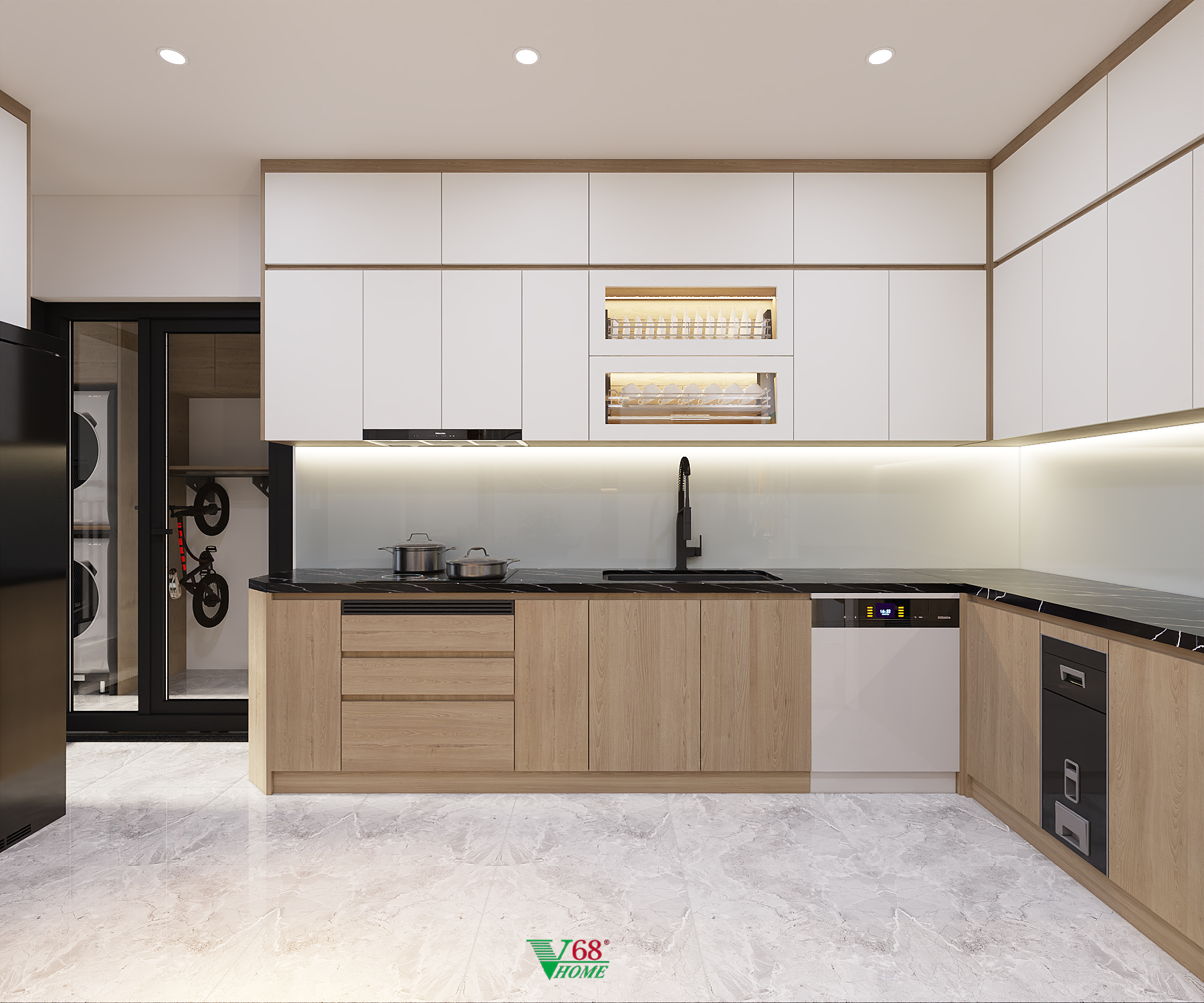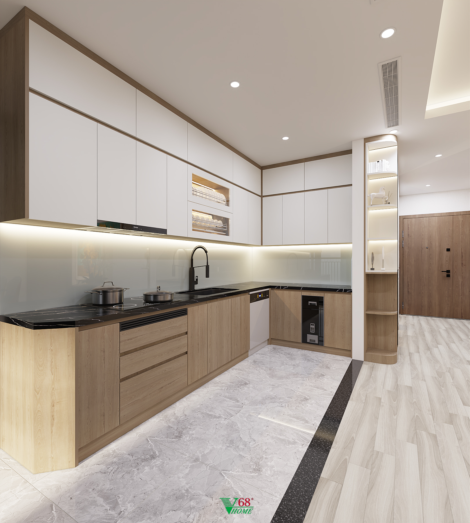 - Tối ưu không gian: Tủ bếp dạng chữ L giúp tận dụng tối đa diện tích, tạo sự gọn gàng cho khu vực nấu nướng.