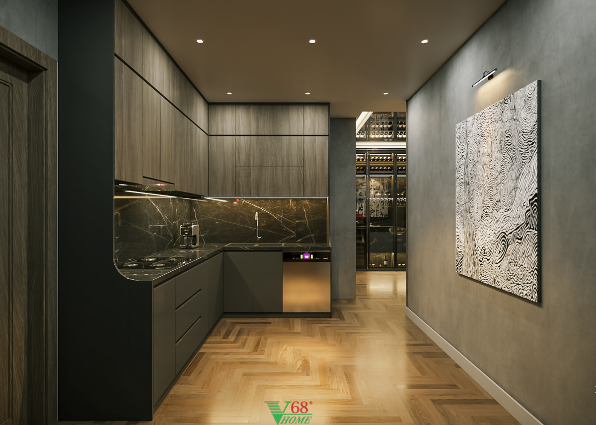 Mẫu tủ bếp TB15 được Nội thất V68 thiết kế và hoàn thiện trọn gói cho căn hộ chung cư tại dự án Ciputra Hà Nội. Mẫu tủ bếp được thiết kế liền tủ giày để tối ưu công năng sử dụng và diện tích cho căn hộ.Tủ được trang trí thêm đèn LED