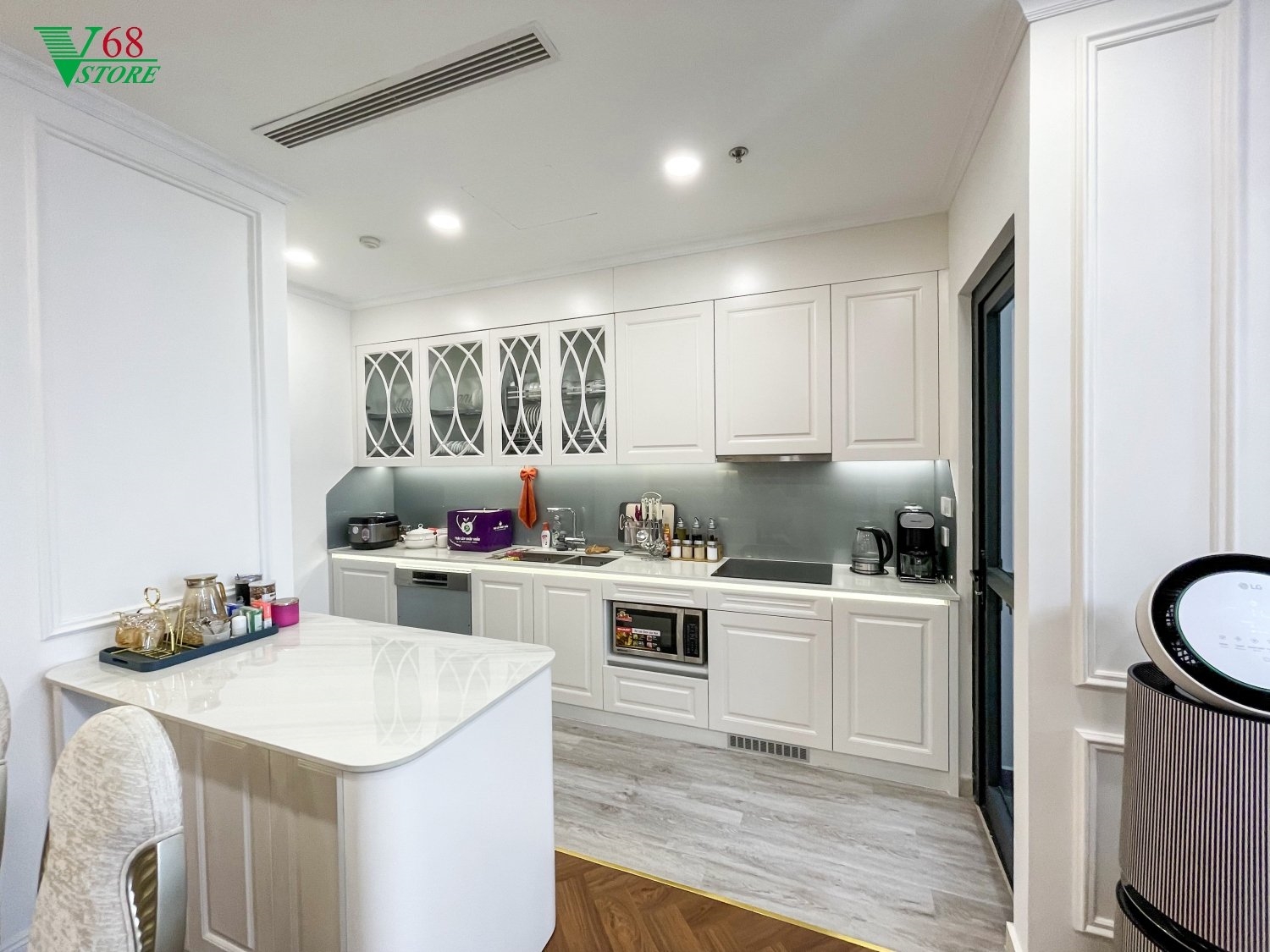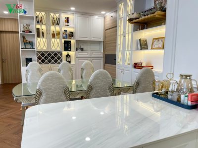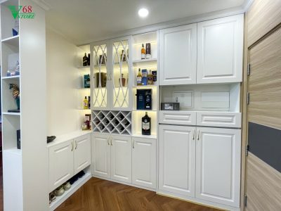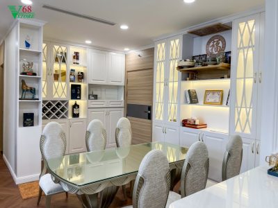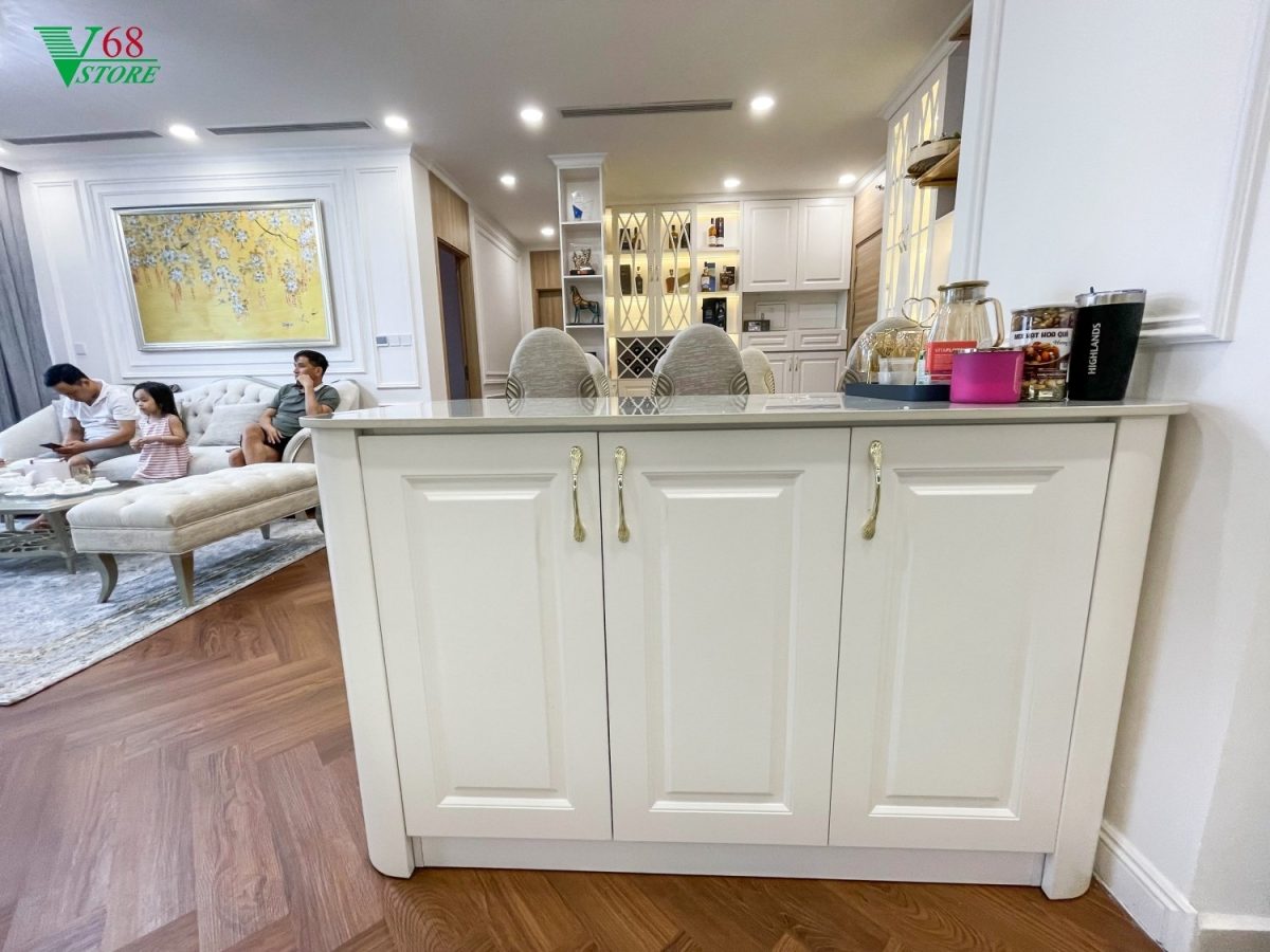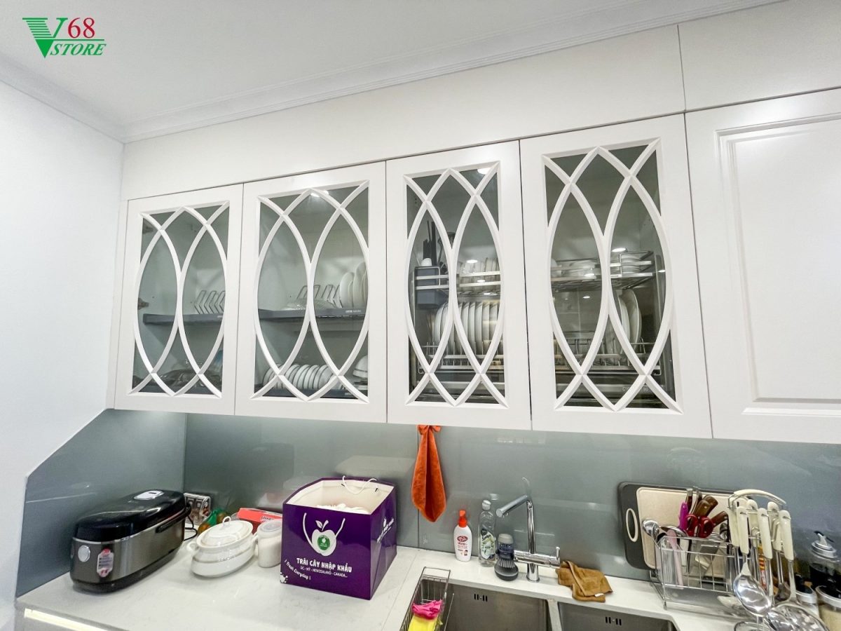 Đây là ảnh sản phẩm mà Nội Thất V68 đã hoàn thiện tại chung cư The Zei Mỹ Đình. Tủ bếp được thiết kế theo phong cách Tân Cổ Điển với điểm đặc trưng là các đường phào chỉ từ tường cho đến nội thất. Chúng tôi lựa chọn vật liệu gỗ MDF xanh chống ẩm An Cường sơn Inchem cao cấp vừa bền bỉ mà an toàn cho sức khỏe. Ngăn tủ đựng bát đĩa sử dụng cánh kính được trang trí thêm các đường line cong. Tủ bếp cũng được trang trí thêm với đèn LED chiếu sáng hiện đại ở viền tủ bếp dưới và tủ bếp trên.