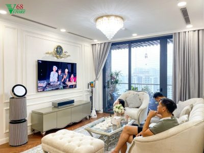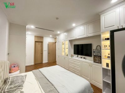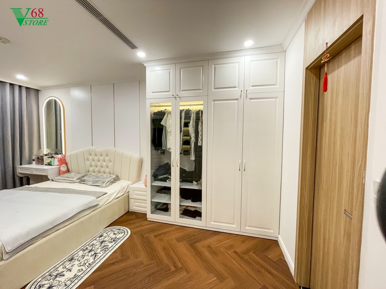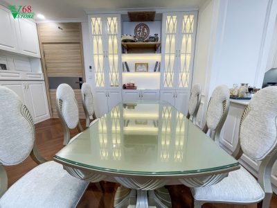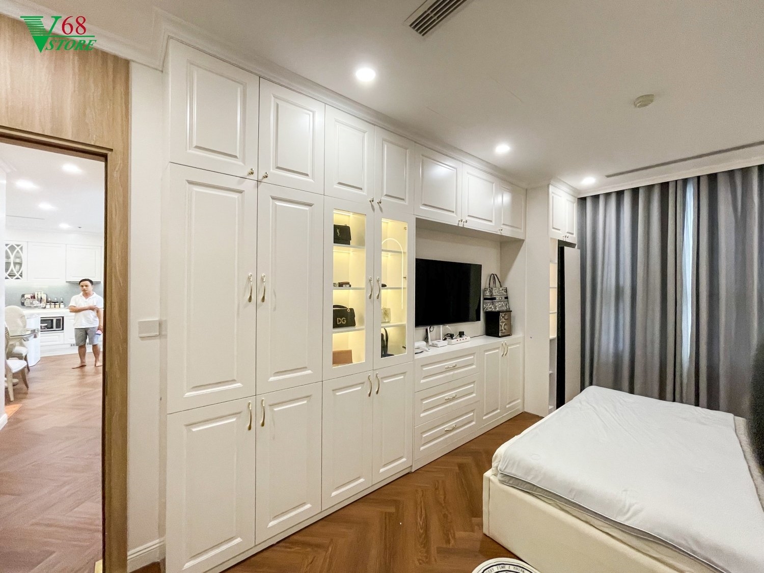 Đây là ảnh sản phẩm mà Nội Thất V68 đã hoàn thiện tại chung cư The Zei Mỹ Đình. Tủ bếp được thiết kế theo phong cách Tân Cổ Điển với điểm đặc trưng là các đường phào chỉ từ tường cho đến nội thất. Chúng tôi lựa chọn vật liệu gỗ MDF xanh chống ẩm An Cường sơn Inchem cao cấp vừa bền bỉ mà an toàn cho sức khỏe. Ngăn tủ đựng bát đĩa sử dụng cánh kính được trang trí thêm các đường line cong. Tủ bếp cũng được trang trí thêm với đèn LED chiếu sáng hiện đại ở viền tủ bếp dưới và tủ bếp trên.