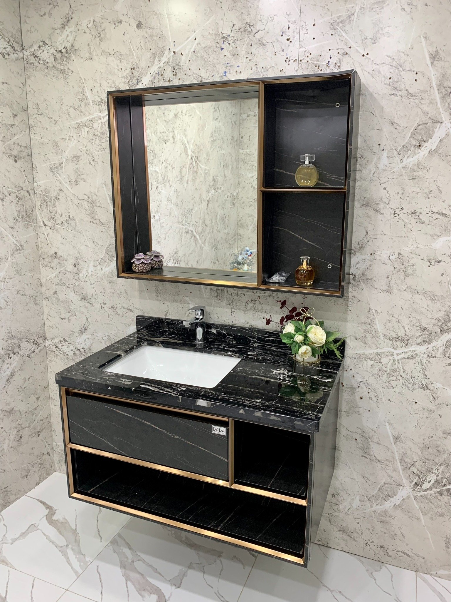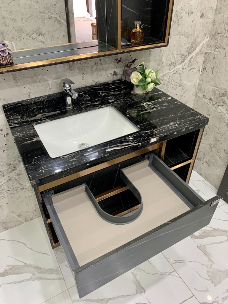 Kích thước tủ chính(Dài x Rộng): 900x530mm. Mặt đá, chậu âm bàn.