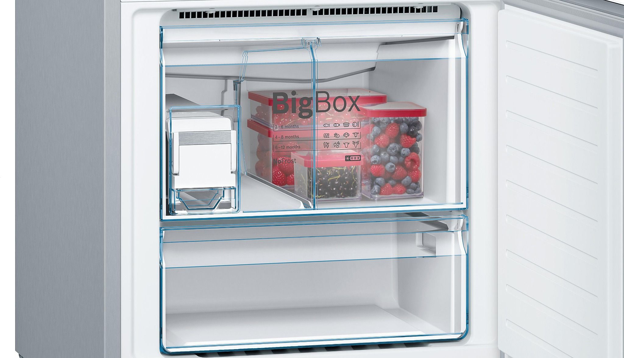 - 2 ngăn chứa thực phẩm được kéo ra hoàn toàn nhờ hệ thống ray trượt mở toàn phần