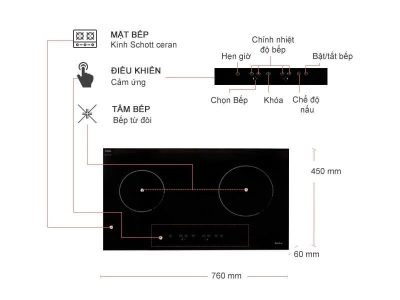 Bếp từ VHI72520STU được thiết kế 2 vùng nấu có công suất như sau